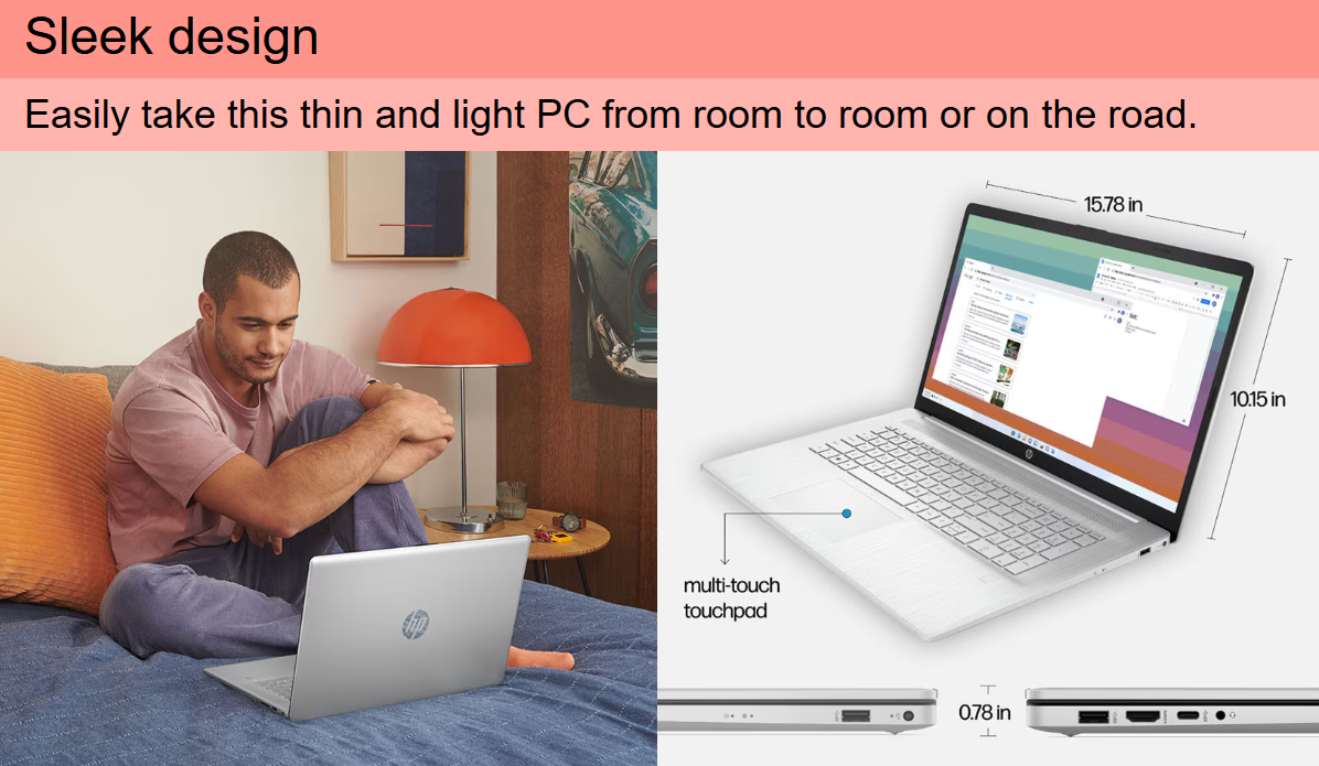 Reliable performance with Intel processor: The HP 17.3-inch laptop offers impressive performance with an Intel processor, fast Wi-Fi, and generous storage capacity for seamless multitasking.
