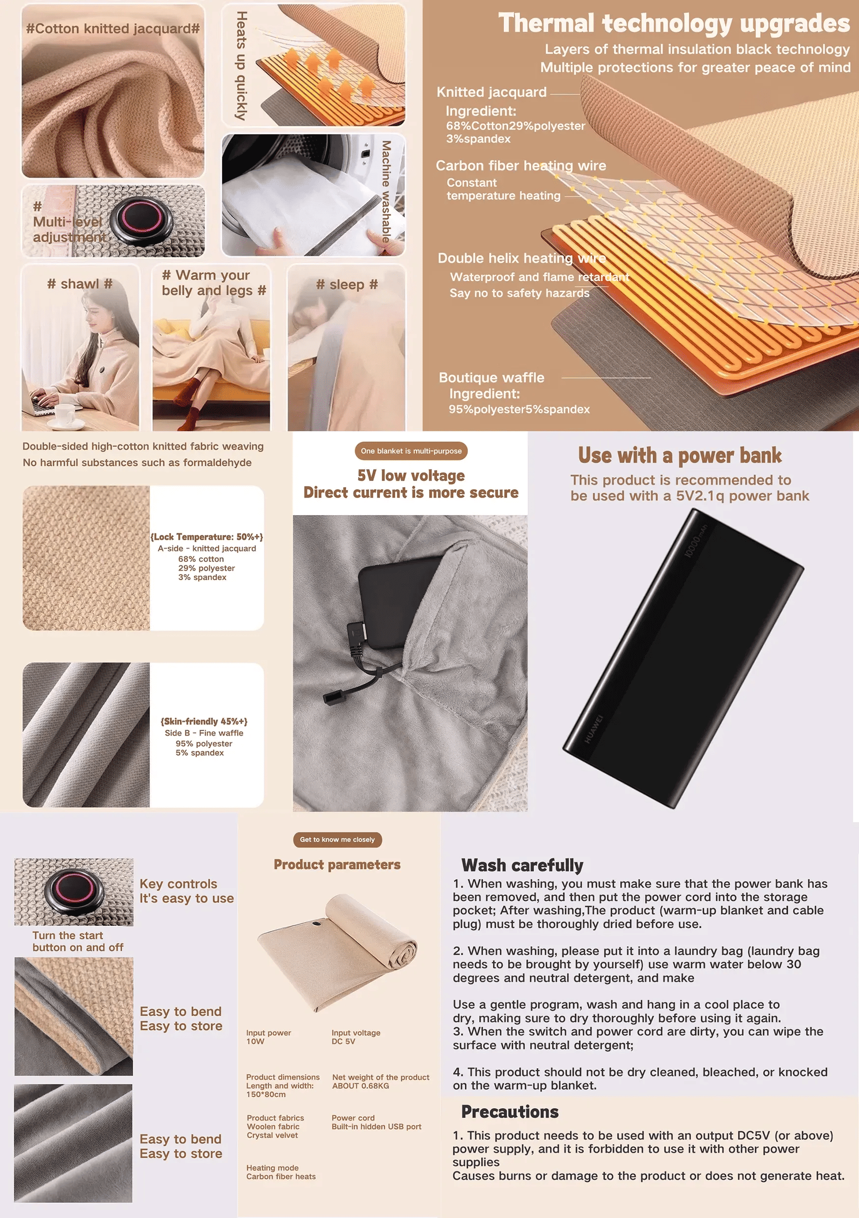 A blanket multi-purpose: infiltration - heating, carbon fiber emission of far-infrared light waves to stimulate cellular self-heating from the inside out to feel the warmth.