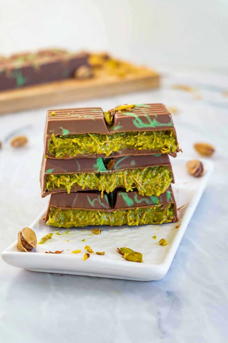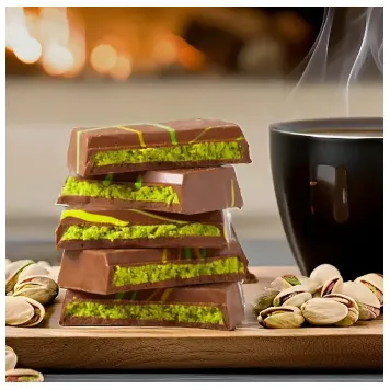 This chocolate redefines modern indulgence with a rich blend of velvety cocoa, toasted pistachios, and delicate sweetness, unfolding into a captivating finish of smooth, silky chocolate, nutty undertones, and a touch of caramelized perfection.