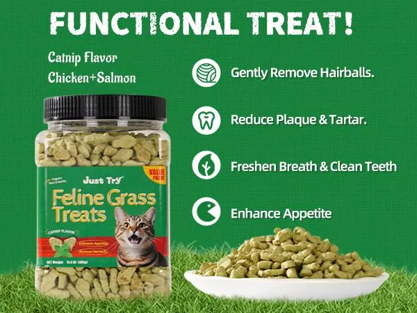 JUST TRY 13.4 OZ Cat Grass Treats✨ Natural Catnip Flavor ✨ These treats offer a natural catnip flavor, making them a tasty snack for your cat. 🐟 Perfect for training and as a healthy snack, these treats are designed to be enjoyable for your cat. 🐾Dental and Hairball ControlThese treats help in dental health and hairball control, ensuring your cat stays healthy. 🦷 No need to plant; these treats are ready to use. 🌱Value PackComes in a 13.4 oz value pack, providing plenty of treats for your cat. 📦 Ideal for cats looking to reduce hairballs. Give your cat the best with JUST TRY cat grass treats. 🌿Free Scarf for Your Cat🎁 Buy 2 and get 20% off & a free scarf for your cat! 🐱