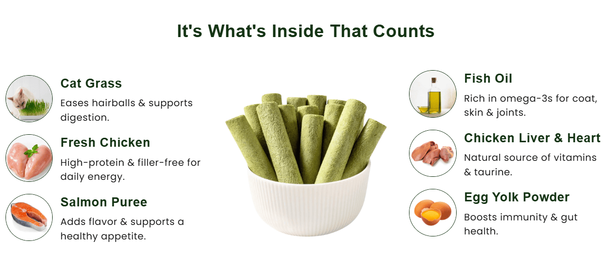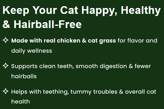 🐱 Flavor: Irresistible Natural Chicken & Fresh Cat Grass