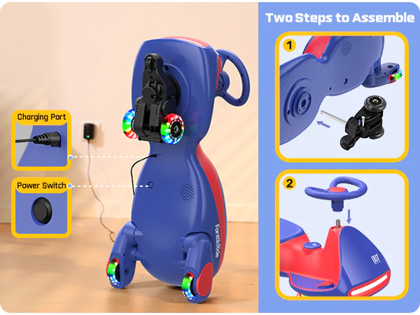 Just two steps, you can quickly finish the installation of the motorized wiggle car. This innovative ride-on toy is suitable for boys and girls aged three and up.