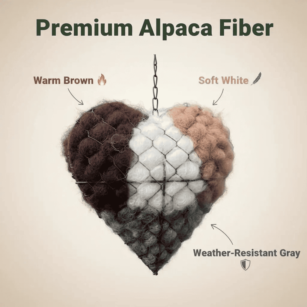 Bring nature closer to home with this Handmade Alpaca Fiber Bird Nesting Heart, a charming blend of rustic yard décor and bird-friendly functionality. Carefully crafted with luxuriously soft alpaca fiber sourced directly from our own alpaca ranch, this heart-shaped nesting aid helps birds build warmer, safer nests—especially during spring and colder seasons.