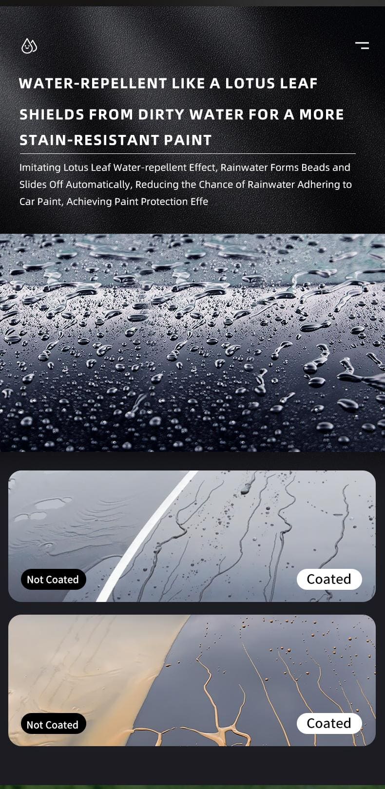 Gracias a fórmulas nanotecnológicas avanzadas, la superficie de su auto formará una capa protectora que dura meses y proporciona un brillo duradero. Elimine las manchas de agua, la oxidación y muchos otros contaminantes que pueden dañar la pintura del auto.